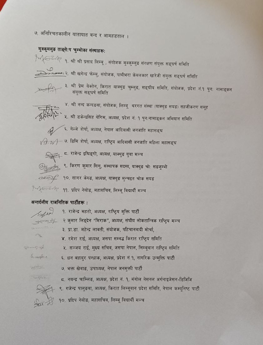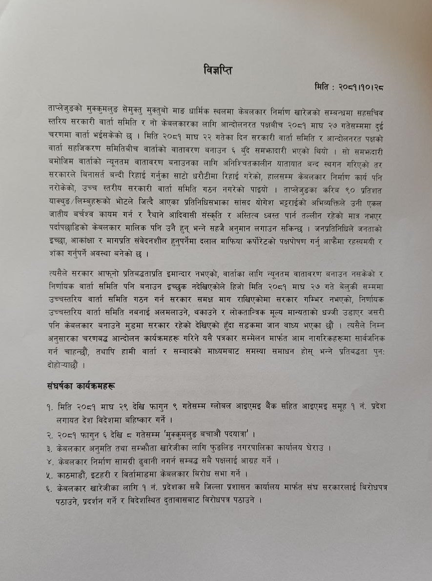 सोमबार पत्रकार सम्मेलन गर्दै मुक्कुमलुङ ताङ्सेःप चुम्भोका ११ संस्था र १० वटा अन्तर्दलीय राजनीतिक पार्टीले संयुक्त रूपमा माघ २९ गतेदेखि आन्दोलनको घोषणा गरेका छन् ।