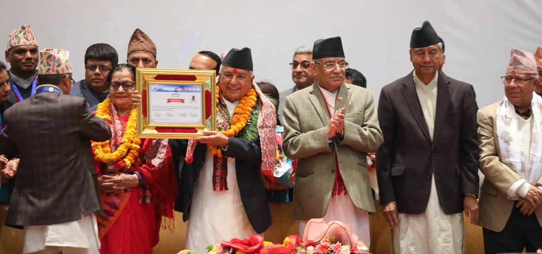 काठमाण्डु- नौ दलको तर्फबाट राष्ट्रपतिको उम्मेदवार भएका नेपाली कांग्रेसका वरिष्ठ नेता रामचन्द्र पौडेललाई राष्ट्रपति पदमा निर्वाचित भएको प्रमाणपत्र प्रदान गरिएको छ ।
