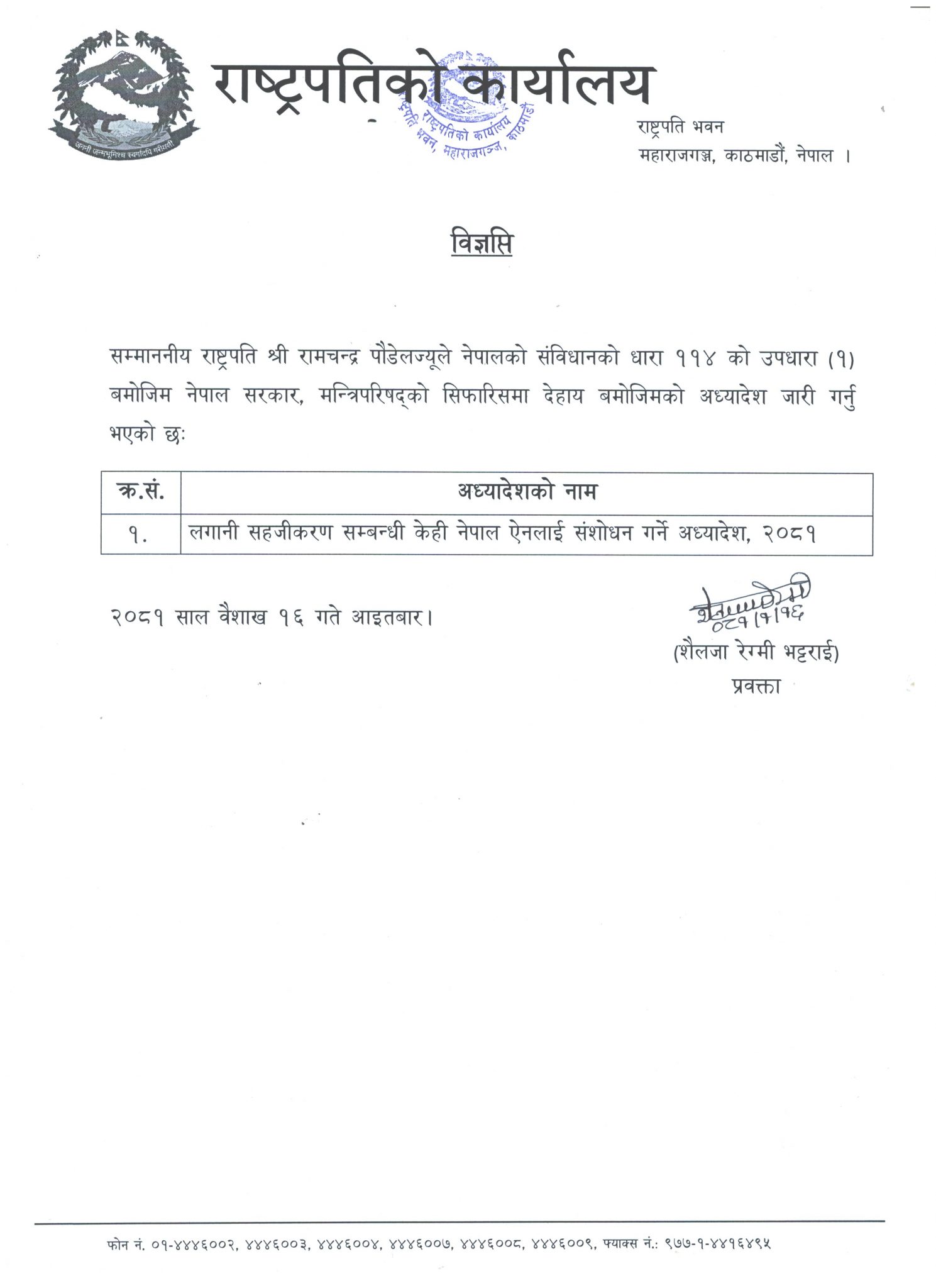 राष्ट्रपतिले संविधानको धारा ११४ को उपधारा १ बमोजिम सरकारको सिफारिसमा सो अध्यादेश जारी गरेको राष्ट्रपति कार्यालयकी प्रवक्ता शैलजा रेग्मी भट्टराईले जारी गरेको विज्ञप्तिमा उल्लेख छ ।