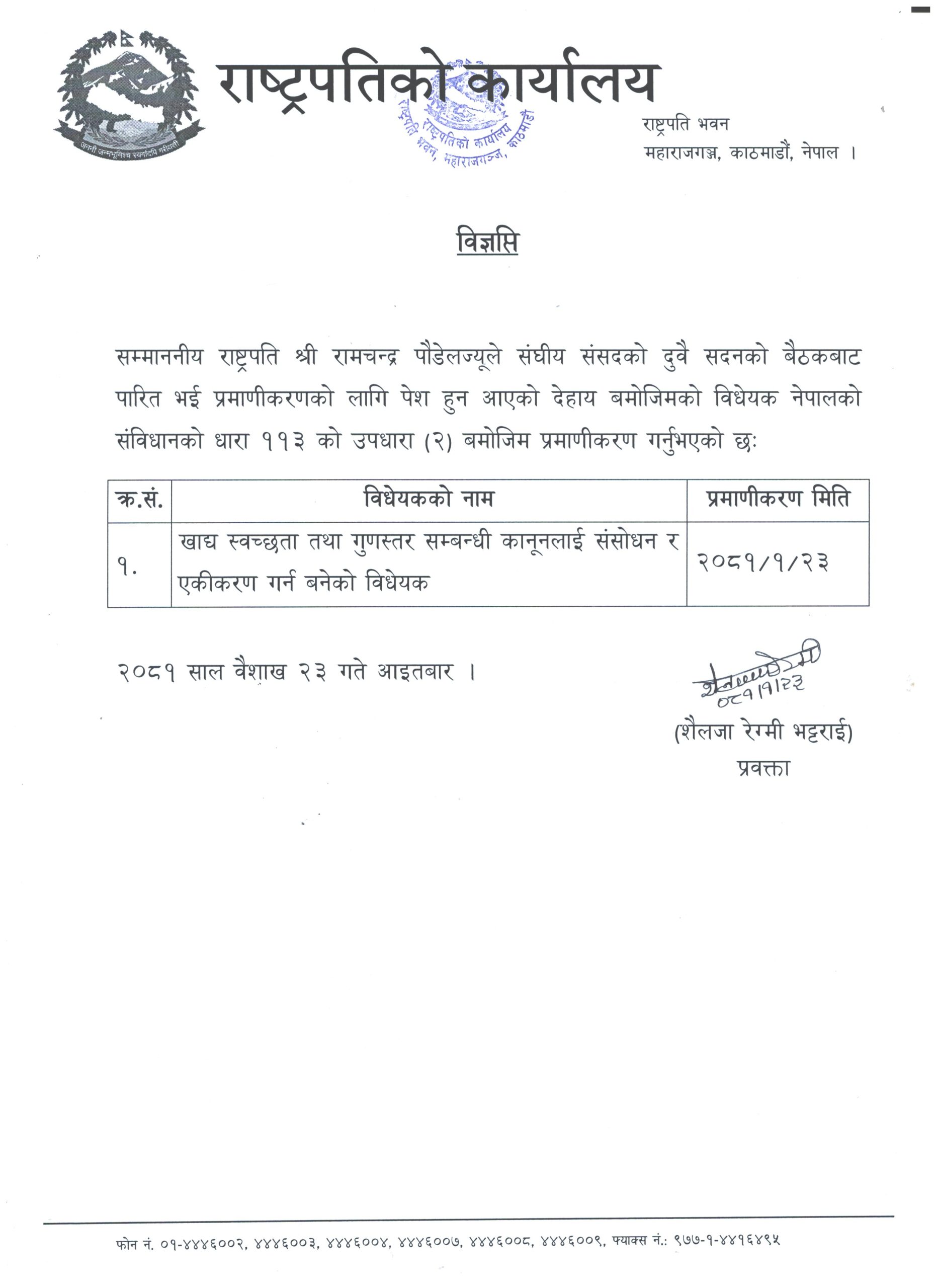 काठमाण्डु- राष्ट्रपति रामचन्द्र पौडेलले खाद्य गुणस्तर सम्बन्धी कानुनलाई संसोधन र एकीकरण गर्न बनेको विधेयक प्रमाणीकरण गरेका छन् ।