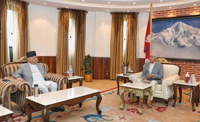 काठमाण्डु – राष्ट्रपति रामचन्द्र पौडेल र प्रमुख प्रतिपक्षी दल नेकपा (एमाले)का अध्यक्ष केपी शर्मा ओलीबीच भेटवार्ता भएकाे छ। बुधबार राष्ट्रपति भवन शीतलनिवासमा राष्ट्रपति पौडेल र एमाले अध्यक्ष ओलीबीच भेटवार्ता भएकाे हाे।