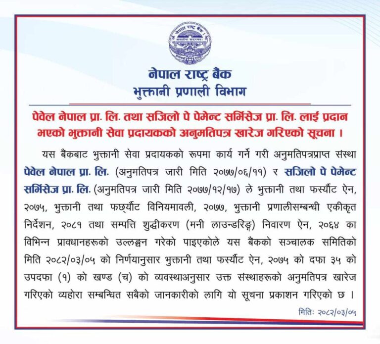 काठमाण्डु – नेपाल राष्ट्र बैंकले पेवेल नेपाल र सजिलो पेमेन्ट सर्भिसेजको अनुमतिपत्र खारेज गरेको छ । भुक्तानी सेवा प्रदायक संस्था पेवेल र सजिलोले हुन्डी र तस्करीमा सहयोग गरेको भन्दै दुवै संस्थाको लाइसेन्स खारेज गरिएको हो ।