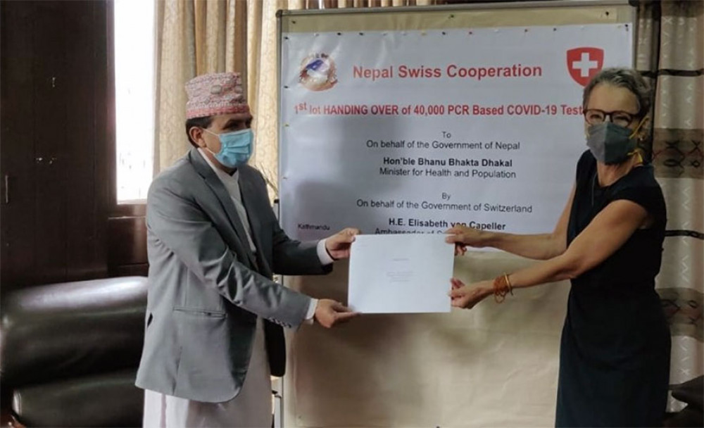 काठमाण्डु – स्विटजरल्याण्ड सरकारले नेपाललाई कोरोना संक्रमण परीक्षण गर्न २० हजार टेस्ट किट सहयोग गरेको छ । कोरोना संक्रमण परीक्षणमा सहयोग भन्दै नेपालस्थित स्विस राजदूत एलिजावेथ भोन क्यापेलरले शुक्रबार स्वास्थ्यमन्त्री भानुभक्त ढकाललाई सो किट हस्तान्तरण गरेकी हुन्।