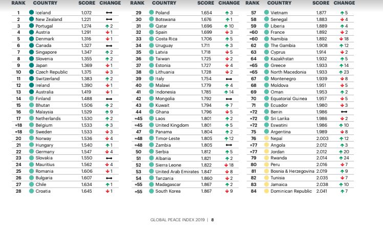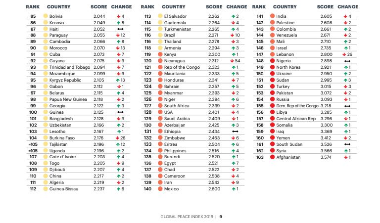 २०१९ को रिपोर्टमा अनुसार ८६ देशहरुमा सुधार आएको छ भने ७६ राष्ट्रहरुको शान्ति अवस्था खस्कँदै गएको देखाएको छ । विश्व शान्तिको सूचीमा आइसल्यान्ड पहिलो स्थान कायमै छ भने अफगानिस्तान अन्तिम स्थानमा छ ।
