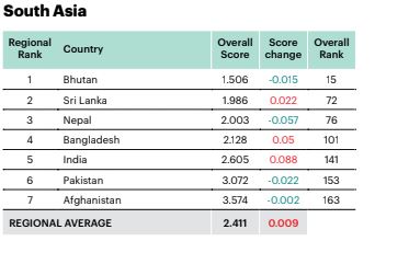 त्यस्तै पाकिस्तान पनि २ स्थान तल १५३ मा रहेको छ । चीन पनि नेपालभन्दा तल ११० औँ स्थानमा रहेको छ । अमेरिका पनि अशान्त देशको सूचीमा छ । अमेरिका चार स्थान तल झर्दै १२८ स्थानमा पुगेको छ ।