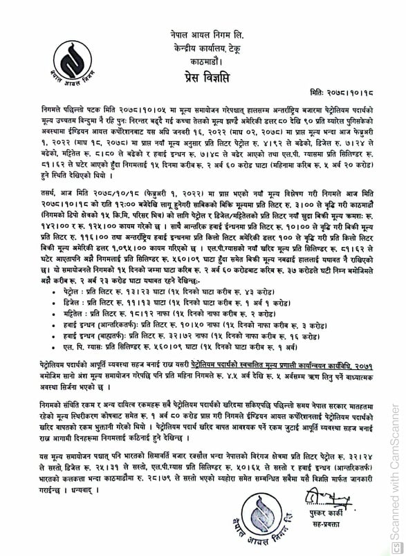 काठमाण्डु – नेपाल आयल निगमले पेट्रोलियम पदार्थको मूल्यवृद्धि गरेको छ ।
