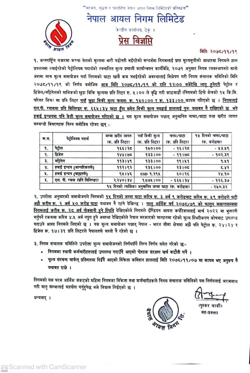 नयाँ मूल्य अनुसार उपत्यकामा अब पेट्रोल प्रतिलिटर १५० रुपैयाँ तथा डिजेल र मट्टितेल १३३ रुपैयाँ पर्ने निगमले जनाएको छ । यस्तै, निगमले हवाई इन्धन आन्तरिकतर्फ प्रतिलिटर १० रुपैयाँ मूल्य बढाएको छ ।