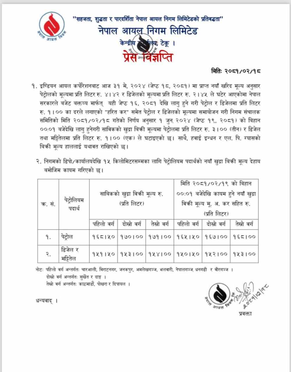 निगमले शुक्रबार प्रेस विज्ञप्ति जारी गर्दै पेट्रोलको मूल्य प्रतिलिटर ३ रुपैयाँ र डिजेल तथा मट्टितेलको मूल्य प्रतिलिटर १ रुपैयाँले घटेको जनाएको छ ।