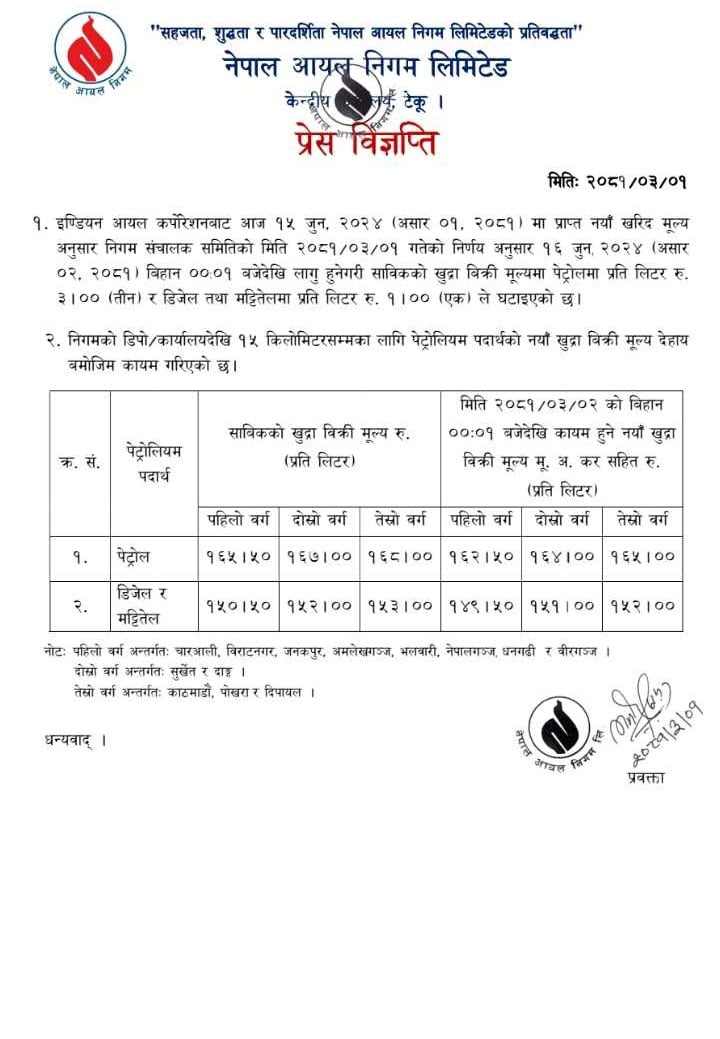 निगमले पेट्रोलको मूल्य ३ रुपैयाँ तथा डिजेल र मट्टितेलको मूल्य १ रुपैयाँ घटाएको छ ।