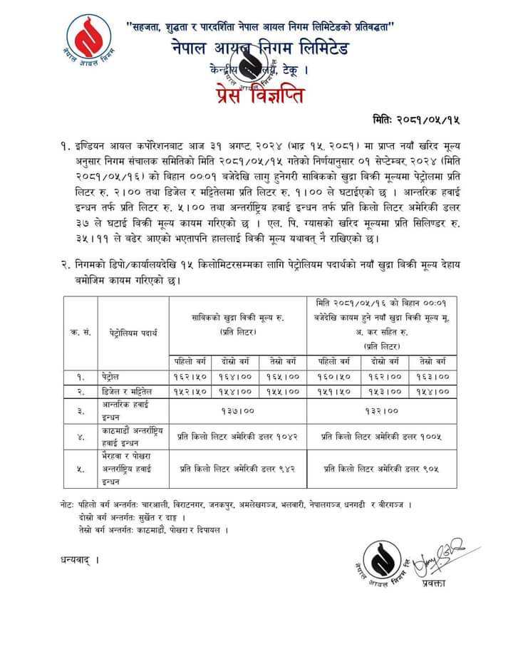 निगमले आईतबारदेखि लागू हुने गरी पेट्रोल प्रतिलिटर २ रूपैयाँ र डिजेल तथा मट्टितेलको मूल्यमा १ रूपैयाँ घटाएको छ ।