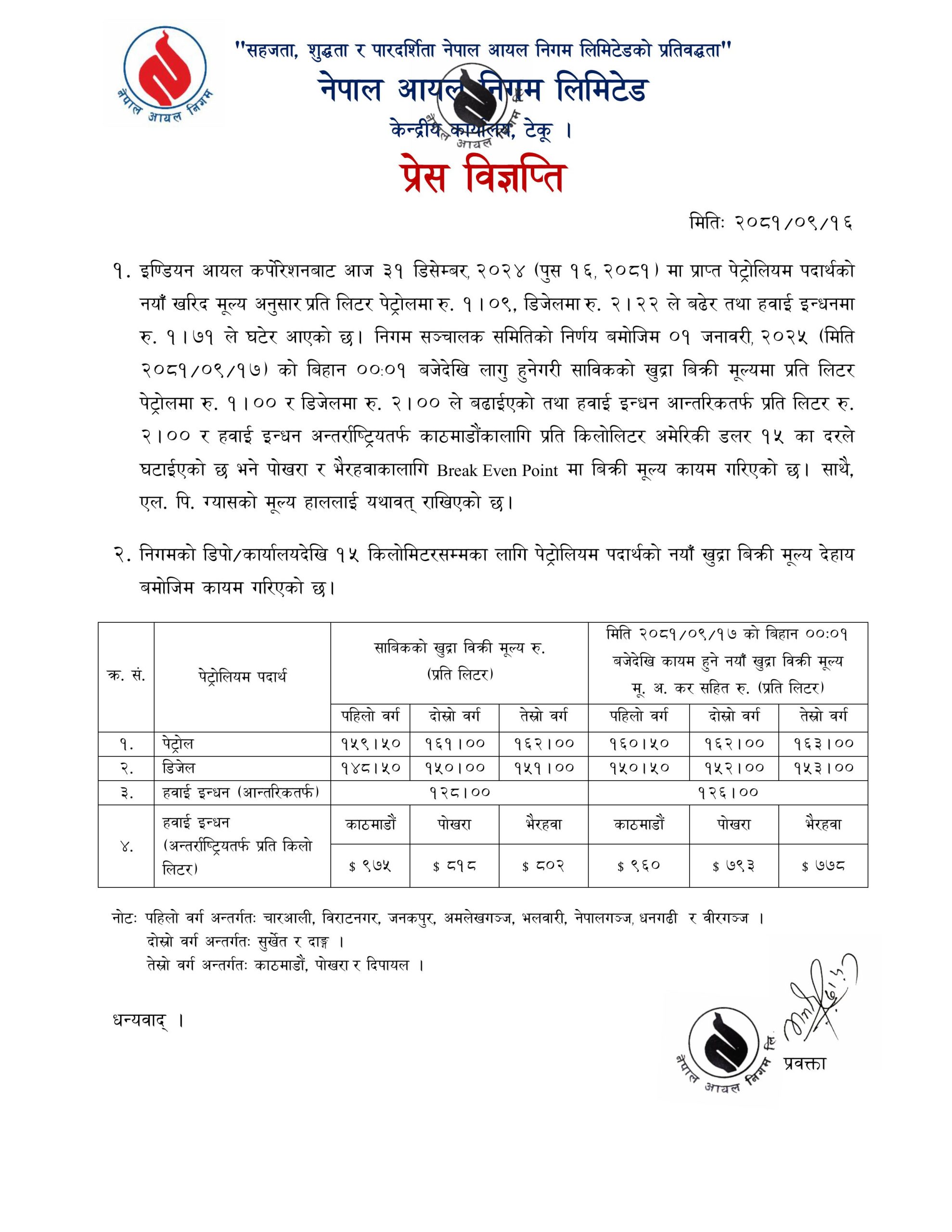 हवाई इन्धन आन्तरिकतर्फ प्रतिलिटर १२६ रुपैयाँ र अन्तराष्ट्र्रियतर्फ प्रतिकिलोलिटर काठमाण्डुमा ९६०, पोखरामा ७९३ र भैरहवामा ७७८ डलर रहेको निगमले जनाएको छ ।