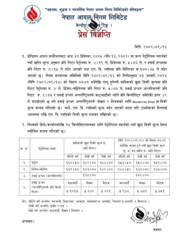 निगमले बुधबारदेखि लागू हुने गरी पेट्रोलियम पदार्थको मूल्य घटाएको हो ।
