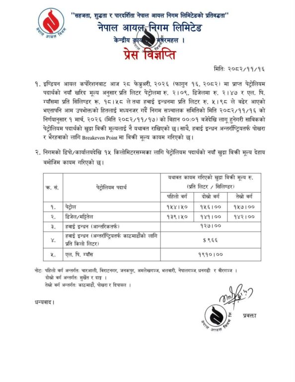 पेट्रोलमा प्रतिलिटर २.१०, डिजेलमा २.४६ र एलपी ग्यासमा प्रतिसिलिन्डर १८.५८ रुपैयाँले वृद्धि भए पनि निगमले मूल्यवृद्धि नगरी मूल्य यथावत् राखेको छ ।