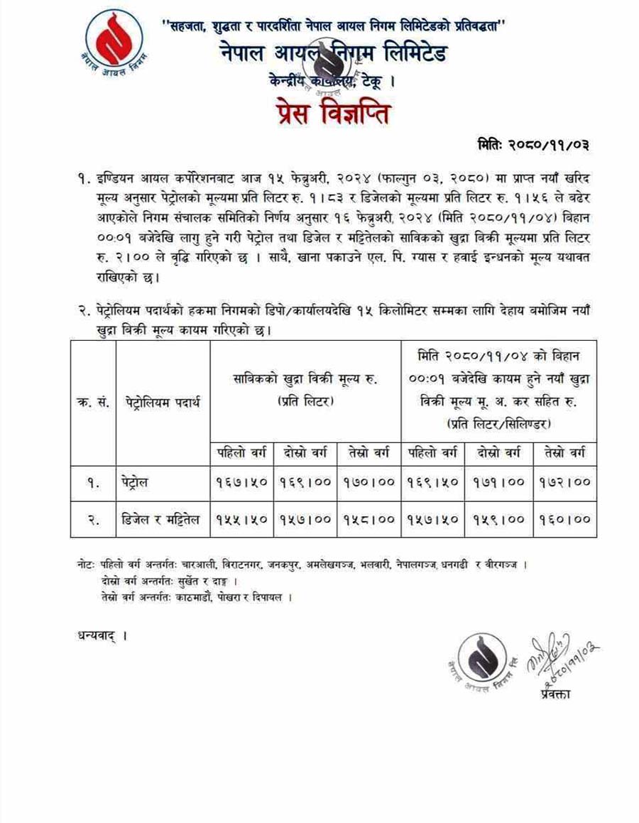 निगमले मूल्य अभिवृद्धि करको प्रभाव एवं हालसालै लागू भएको पेट्रोलियम पदार्थ तथा ग्यासको स्वचालित मूल्य प्रणाली कार्यविधि-२०८० अनुसार आइओसीले पठाएको मूल्यमा नेपाली बजारको भाउ तय गरिएको जनाएको छ।