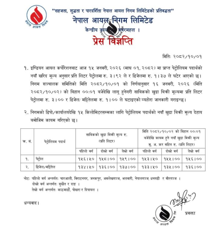 शुक्रबारदेखि लागू हुने गरी पेट्रोल प्रति लिटरमा तीन रुपैयाँ र डिजेल–मट्टीतेल प्रति लिटरमा एक रुपैयाँ भाउ घटाइएको हो ।
