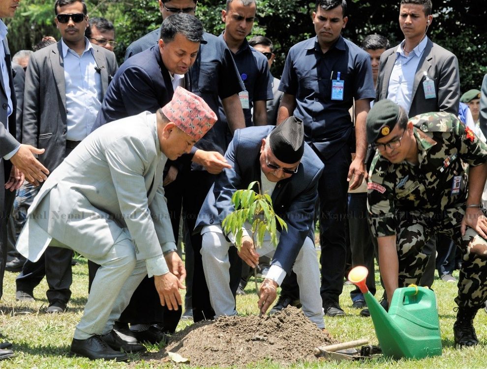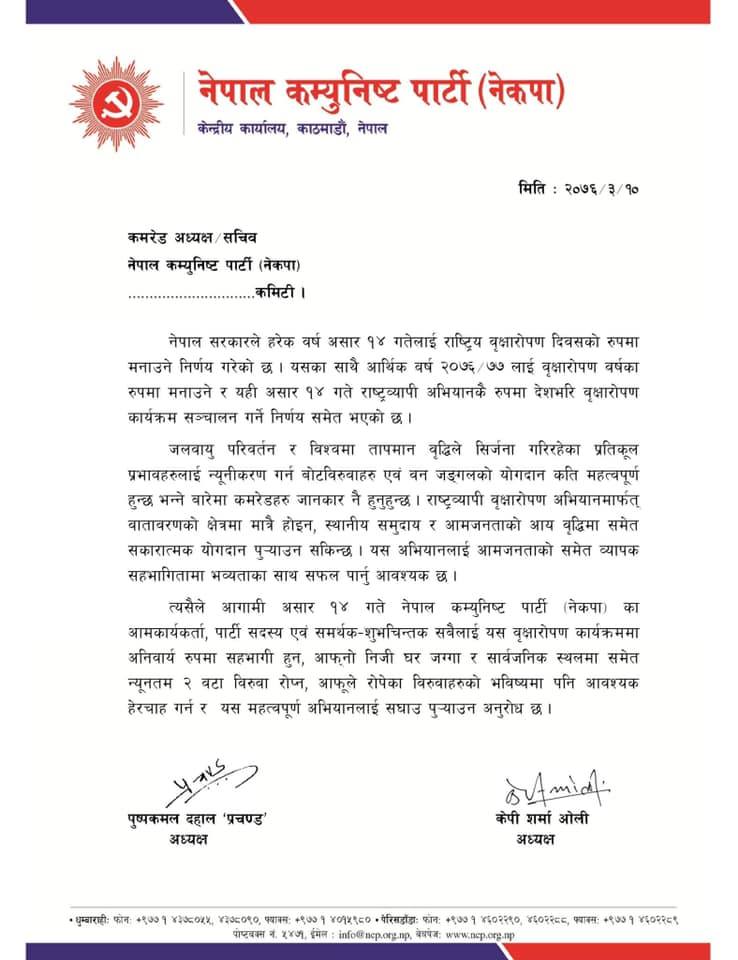 सरकारले आगामी आर्थिक वर्षलाई वृक्षरोपण वर्ष र आगामी १४ असारमा राष्ट्रिय वृक्षरोपण दिवस मनाइरहेका बेला नेकपाका अध्यक्ष द्वय केपी शर्मा ओली र पुष्पकमल दाहाल ‘प्रचण्ड’ ले अभियान सफल पार्न आह्वान गरेका छन्। अध्यक्षद्वयले बुधबार एक वक्तव्य जारी गरी वृक्षरोपणमा अनिवार्य रुपमा उपस्थित हुन आफ्ना नेता, कार्यकर्तालाई निर्देशन दिएका छन् भने आमनेपालीलाई पनि सहभागिताका लागि आह्वान गरेका छन्।