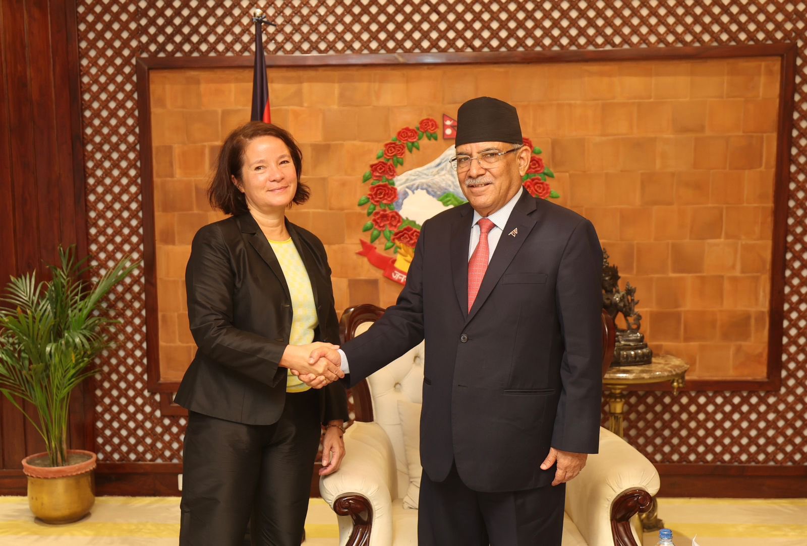 काठमाण्डु- नेपालका लागि युरोपेली संघकी राजदूत नोना डेप्रेजले प्रधानमन्त्री पुष्पकमल दाहाल प्रचण्डसँग भेटवार्ता गरेकी छन् । मंगलबार बिहान बालुवाटारस्थित प्रधानमन्त्रीको सरकारी निवासमा पुगेकी राजदूत डेप्रेजले प्रधानमन्त्री प्रचण्डसँग बिदाइ भेटवार्ता गरेकी हुन् ।