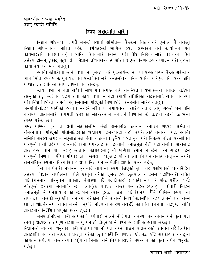 प्रचण्डलाई शर्माको पत्र- बिनालाई जिम्मेवारी दिएर अरुलाई पार्टीमा स्थान छैन भन्ने सन्देश दिइयो