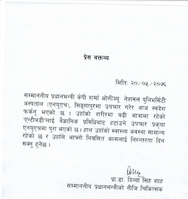 काठमाडौं – भदौ ५ गते उपचार गराउन सिंगापुर गएका प्रधानमन्त्री केपी शर्मा ओली शुक्रबार (आज) स्वदेश फर्किए लगत्तै आफ्ना नियमित कामलाई निरन्तरता दिन सक्ने उनका निजी चिकित्सक डा. दिव्या सिंह शाहले बताएकी छन्।