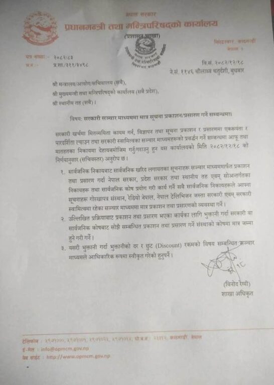 काठमाण्डु– नेपाल सरकार, प्रधानमन्त्री तथा मन्त्रिपरिषद्को कार्यालयले सरकारी खर्चमा मितव्ययिता कायम गर्न तथा सूचना प्रवाहलाई एकरूप र पारदर्शी बनाउन सरकारी सञ्चार माध्यममार्फत मात्रै सूचना प्रकाशन तथा प्रसारण गर्न निर्देशन दिएको छ ।