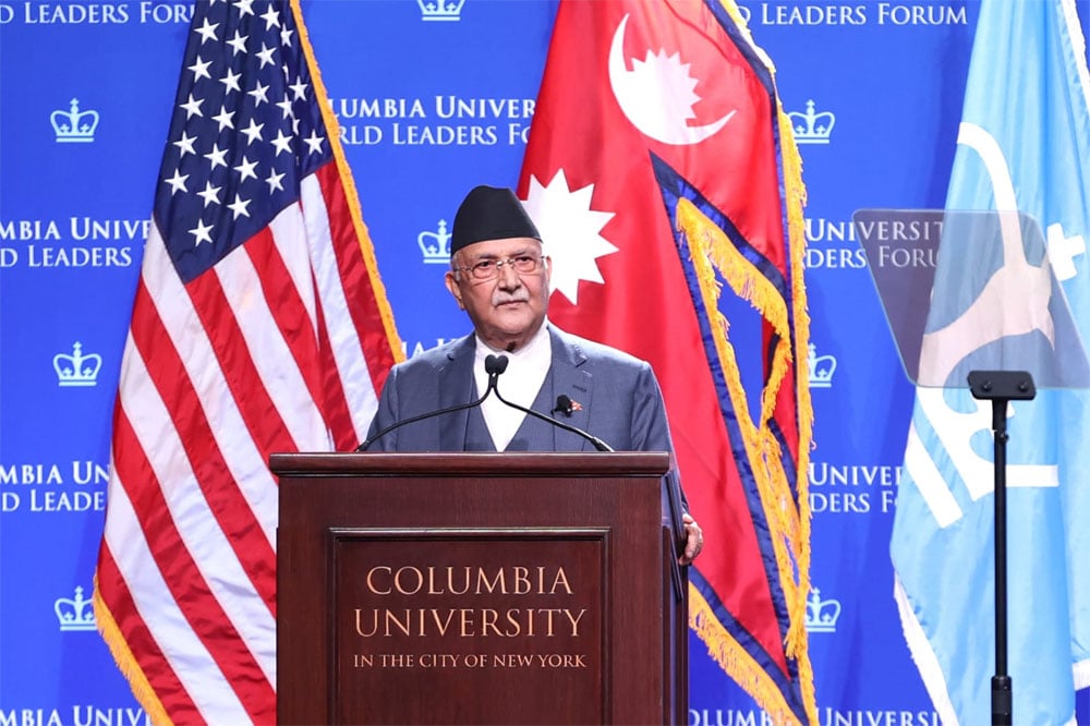 संयुक्त राष्ट्रसंघको ७९औं महासभामा भाग लिन नेपाली प्रतिनिधिमण्डलको नेतृत्व गर्दै संयुक्त राज्य अमेरिकाको न्युयोर्कमा रहेका प्रधानमन्त्री ओलीले सोमबार कोलम्बिया विश्वविद्यालयद्वारा आयोजित वल्ड लिडर्स फोरममा गरिबी निवारण गरी सबैलाई सम्मानजनक रूपमा बाँच्न पाउने अधिकार दिलाउन समृद्ध नेपाल सुखी नेपालीको राष्ट्रिय आकांक्षा अघि सारिएको स्पष्ट पारे।