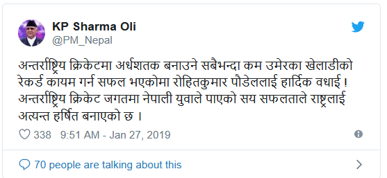 प्रधानमन्त्री ओलीले ट्वीटरमा अन्तर्राष्ट्रिय क्रिकेट जगतमा नेपाली युवाले पाएको सफलताले राष्ट्रलाई अत्यन्त हर्षित बनाएको उल्लेख गर्का छन् । रोहितले शनिबार युएईविरुद्धको अन्तर्राष्ट्रिय एक दिवसीय क्रिकेटमा सर्वाधिक कम उमेरमा अर्धशतक बनाउने खेलाडीको कीर्तिमान बनाएका थिए ।