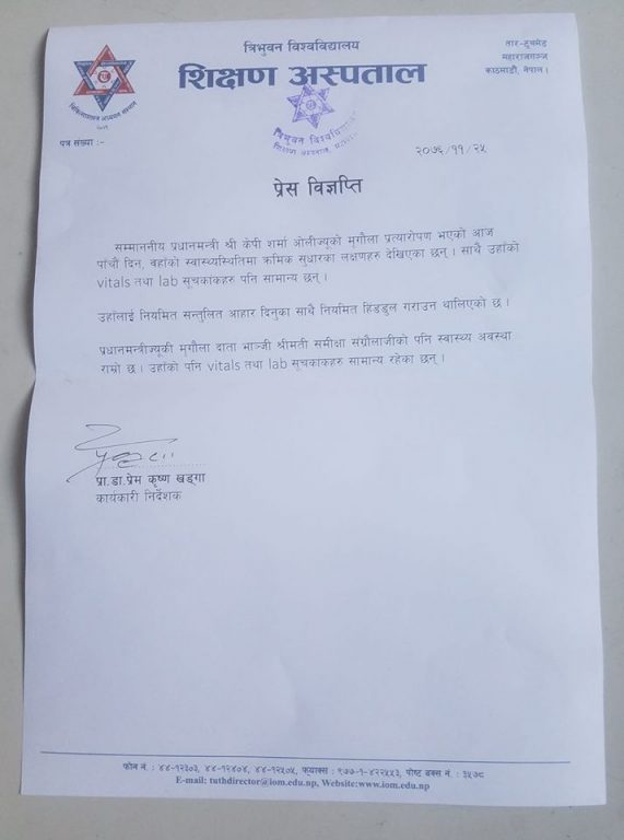 अस्पतालले जारी गरेको स्वास्थ्य अपडेटमा अस्पतालका कार्यकारी निर्देशक प्रेमकृष्ण खड्काले आइतबार जारी गरेको विज्ञप्तिमा प्रधानमन्त्रीको भाइटल तथा ल्याव सुचकाँकहरु पनि सामान्य रहेको उल्लेख छ ।