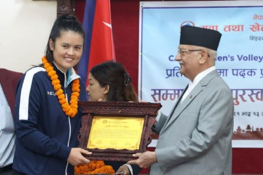 प्रधानमन्त्री निवासमा आज आयोजित कार्यक्रममा नेपाली महिला टोलीका कप्तान अरुणा शाहीसहित १४ खेलाडीलाई जनही ३ लाख, मुख्य प्रशिक्षक जगदीशप्रसाद भट्टलाई २ लाख, सहायक प्रशिक्षक भरत यादव, व्यवस्थापक निलमसिंह बज्राचार्यलाई र फिजियो लोकेन्द्र कुँवरलाई जनही एक लाख २० हजार रुपैयाँ राशीसहित पुरस्कार प्रदान गरिएको हो ।