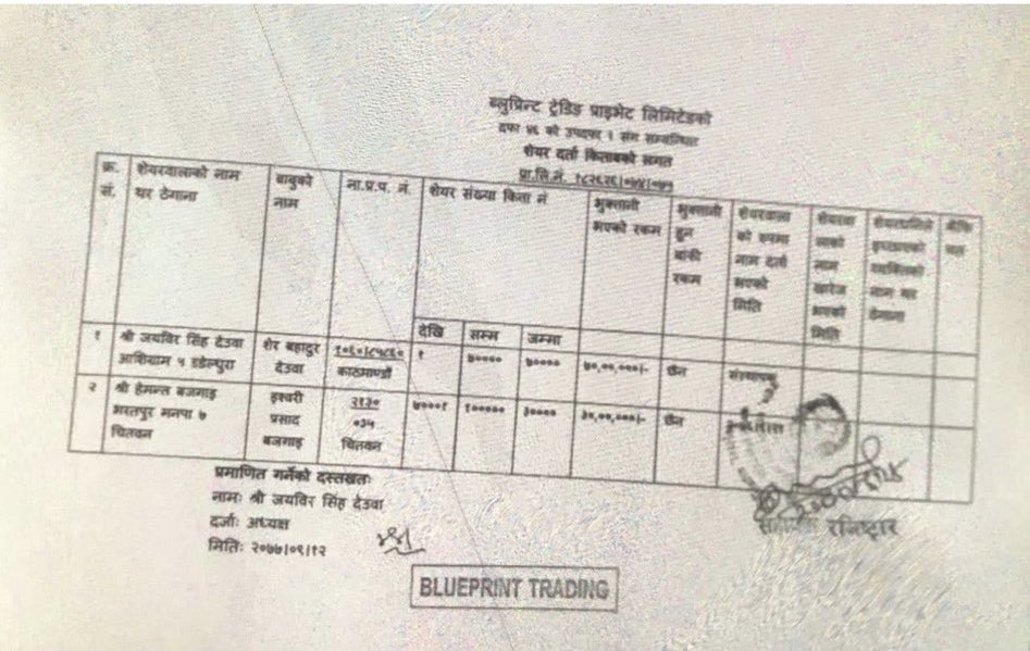 अर्थमन्त्री जनार्दन शर्माले ल्याएको बजेटमा प्रधानमन्त्री पुत्रलाई फाइदा पुग्ने गरी स्यानिटरी प्याडमा भन्सार घटाउने निर्णय गरेका थिए । प्रधानमन्त्री पुत्र जयवीरले ब्लुप्रिन्ट ट्रेडिङमार्फत सेनेटरी प्याडको आयात गरिरहेका छन् । सुरुमा यो कम्पनीमा उनको शतप्रतिशत शेयर थियो । पछी चितवनका हेमन्त बजगाईले ३० प्रतिशत शेयर खरिद गरेको देखिएको छ ।