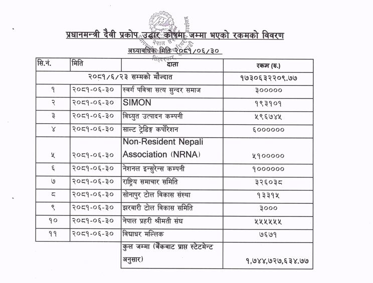 प्रधानमन्त्री तथा मन्त्रिपरिषद् कार्यालयले सार्वजनिक गरेको विवरणअनुसार कोषमा दाखिला भएको सो रकम हिजो असोज ३० गतेसम्मको हो ।