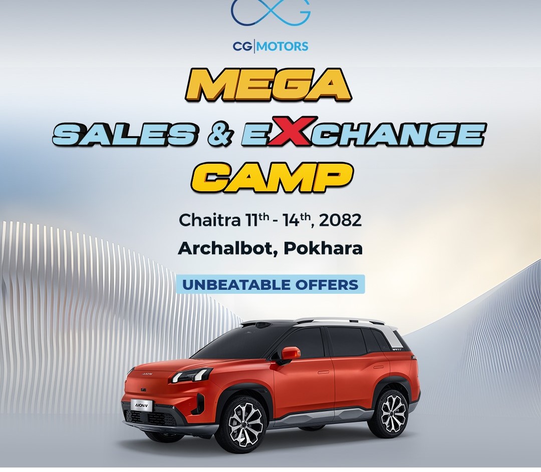 काठमाण्डु– पोखरामा सीजी मोटर्सले मेगा सेल्स एण्ड एक्सचेन्ज क्याम्प आयोजना गर्ने भएको छ । अर्चलबोट पोखरामा चैत ११ देखि १४ गतेसम्म एक्सचेन्ज क्याम्प आयोजना गर्ने भएको हो ।