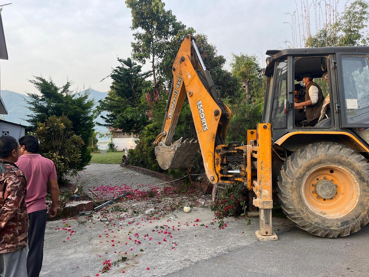 कास्की प्रहरीका प्रवक्ता डीएसपी हरीबहादुर बस्नेतका अनुसार मापदण्ड विपरीत बनेका ३० वटा संरचनामा डोजर चलेको हो ।