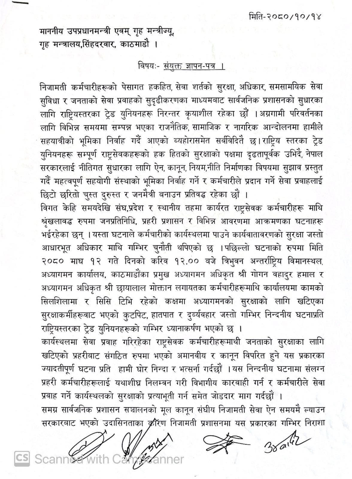 नेकपा एमालेनिकट नेपाल निजामती कर्मचारी संगठन, नेपाली कांग्रेसनिकट नेपाल निजामती कर्मचारी युनियन, नेकपा माओवादी केन्द्रनिकट नेपाल राष्ट्रिय कर्मचारी संगठन, एकीकृत सरकारी कर्मचारी संगठन नेपाल र नेपाल मधेसी निजामती कर्मचारी मन्चले श्रेष्ठलाई ज्ञापन पत्र बुझाउँदै उक्त चेतावनी दिएका हुन् ।