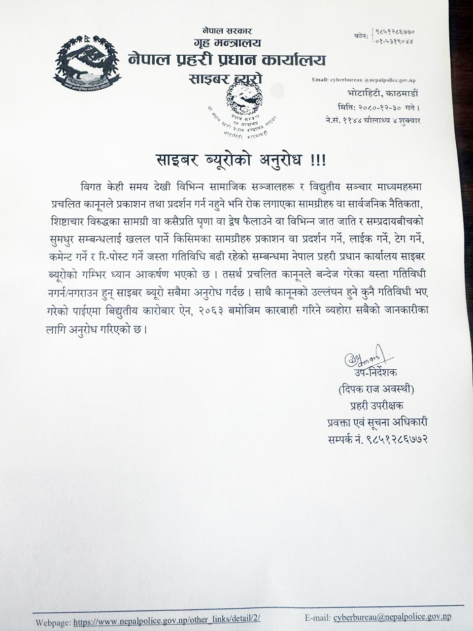 साइबर ब्युरोका प्रवक्ता प्रहरी उपरीक्षक दीपकराज अवस्थीले विगत केही समयदेखि विभिन्न सामाजिक सञ्जालका माध्यमबाट प्रचलित कानूनले प्रकाशन तथा प्रदर्शन गर्न नहुने भनी रोक लगाएका सामग्रीहरू अर्थात् सार्वजनिक नैतिकता, शिष्टाचार विरुद्धका सामग्री, जातजाति र सम्प्रदायबीचको सुमधुर सम्बन्धलाई खलल पार्ने किसिमका गतिविधि बढिरहेकोप्रति ध्यानाकर्षण भएको जनाएका छन् ।