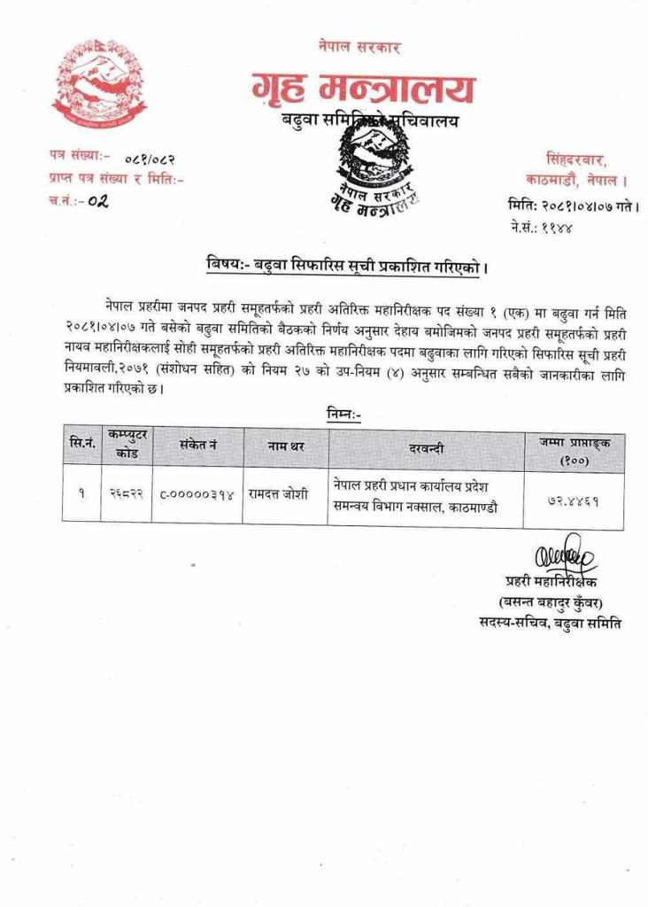 काठमाण्डु – गृह मन्त्रालयले नेपाल प्रहरीका प्रहरी नायव महानिरीक्षक (डीआईजी) रामदत्त जोशीलाई प्रहरी अतिरिक्त महानिरीक्षक (एआईजी) मा बढुवा गर्न सिफारिस गरेको छ ।