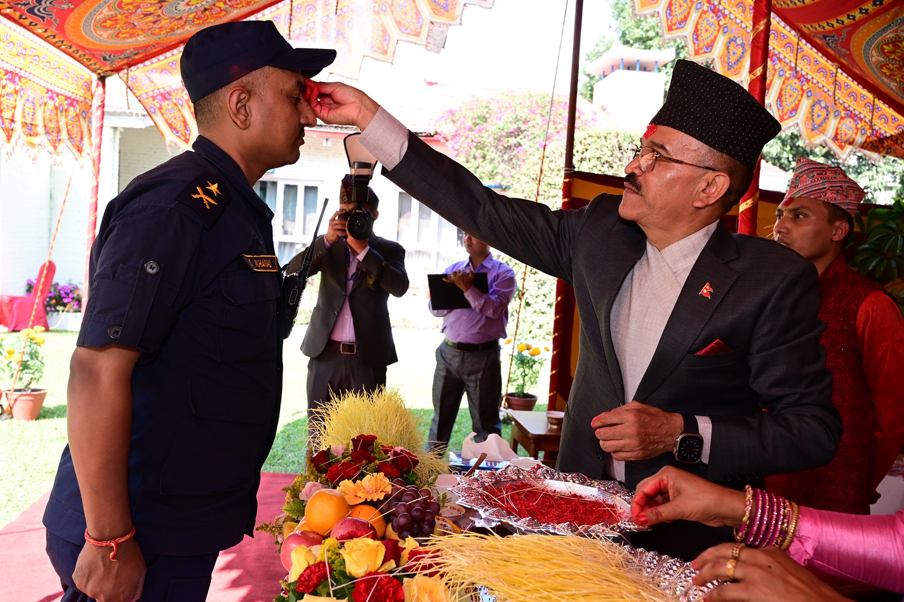 उक्त अवसरमा नेपाल प्रहरी श्रीमती संघकी अध्यक्ष श्रीमती लक्ष्मी कुँवरले टीका ग्रहणका लागि उपस्थित महानुभावहरूलाई जमरा र प्रसाद प्रदान गरेकी थिइन् । ईच्छुक प्रहरी कर्मचारीहरूलाई टीका लगाउनका लागि दिउँसो १ बजेदेखि ३ बजेसम्मको समय तोकिएको थियो ।