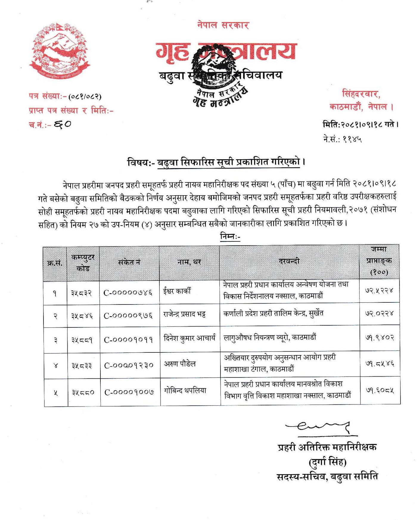 सिफारिस सूचीअनुसार बढुवा सिफारिसमा अन्वेषण योजना तथा विकास निर्देशनालयका ईश्वर कार्की, कर्णाली प्रदेश तालिम केन्द्रका राजेन्द्रप्रसाद भट्ट, लागूऔषध नियन्त्रण ब्युरोका दिनेशकुमार आचार्य, अख्तियार दुरुपयोग अनुसन्धान आयोगका अरुण पौडेल र मानव स्रोत विकास विभाग वृत्ति विकास महाशाखाका गोविन्द थपलिया परेका छन् ।