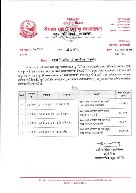 बढुवा सिफारिस समितिका सदस्य सचिव प्रहरी अतिरिक्त महानिरीक्षक दुर्गा सिंहद्वारा प्रकाशित सूचनाअनुसार सिफारिस सूचीको पहिलो नम्बरमा डा. सुष्मा केसीको नाम छ । त्यसपछि क्रमशः डा. पूजा खड्का, डा. दिपक भिन्दवार र डा. अनुज श्रेष्ठलाई बढुवाका लागि सिफारिस गरिएको छ ।