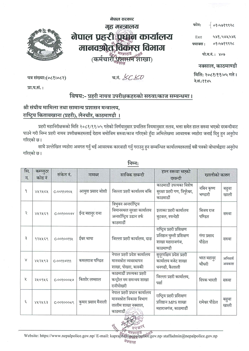 प्रहरी महानिरीक्षकको सोमबारको निर्णयले डीएसपीको सरुवा गरिएको प्रहरी प्रधान कार्यालयले जनाएको छ ।