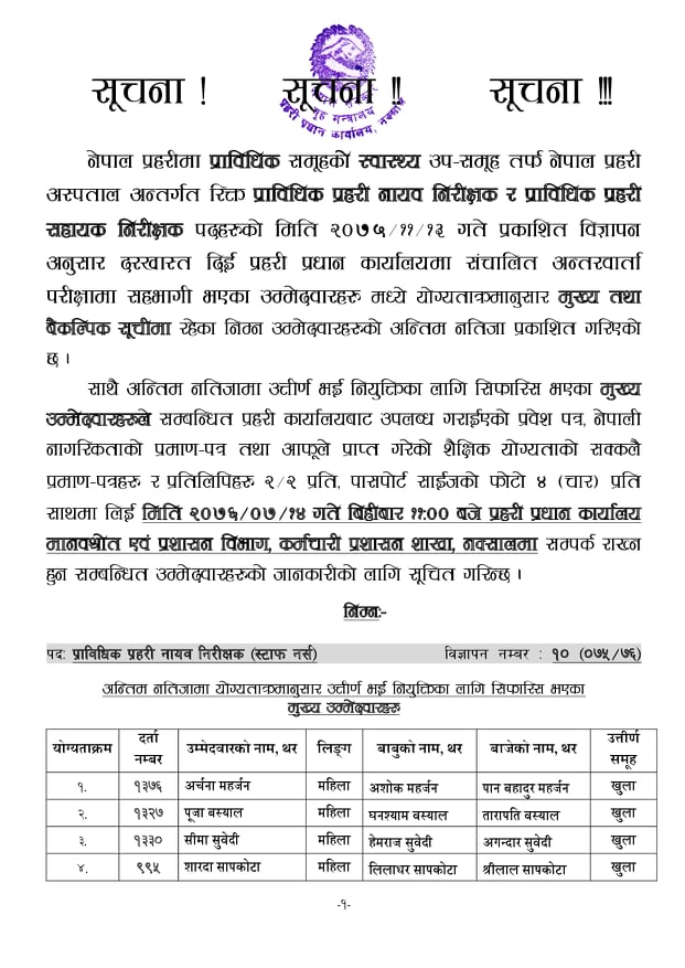 गत फागुन १३ गते प्रकाशित विज्ञापनको नतिजाअनुसार परीक्षामा पास भएका उम्मेद्वारहरुलाई कात्तिक १४ गते प्रहरी प्रधान कार्यालय नक्सालमा सम्पर्क राख्न भनिएको छ ।