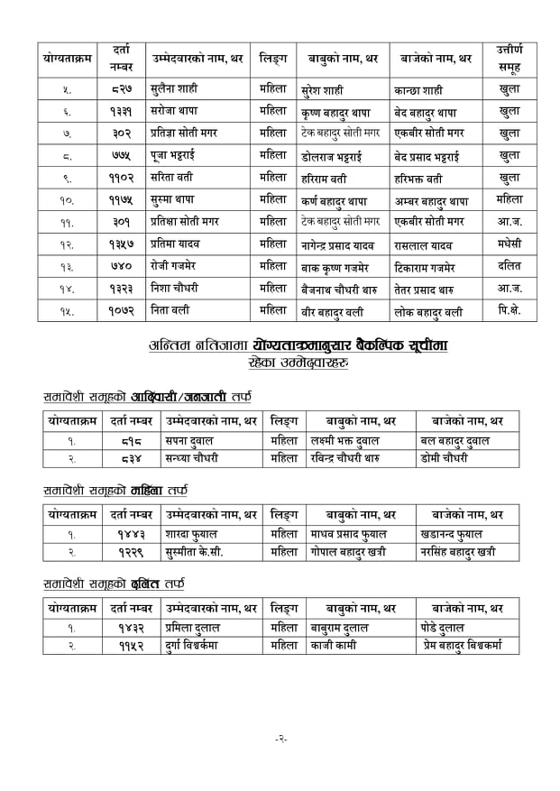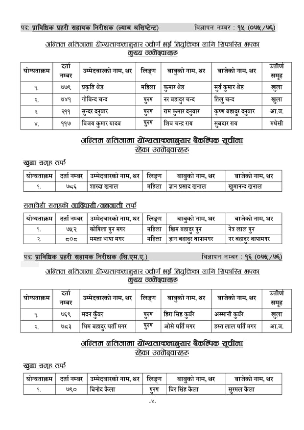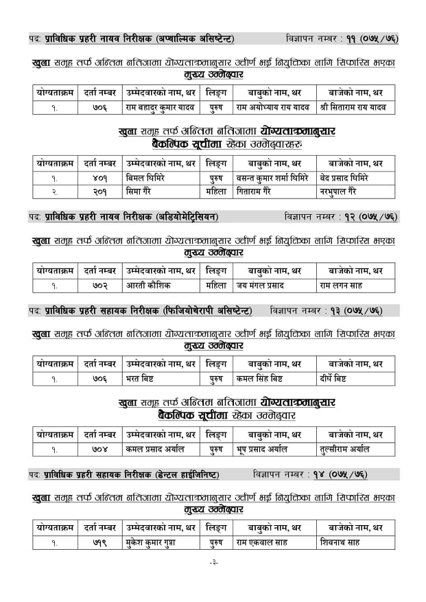 काठमाडौं – नेपाल प्रहरीले प्राविधिक समूहको स्वास्थ्यतर्फको नतिजा प्रकाशित गरेको छ । प्रहरी अस्पताल अन्तर्गतका प्र.ना.नि. र प्र.स.नि.पदहरुको अन्तिम नतिजा प्रकाशित भएको हो ।