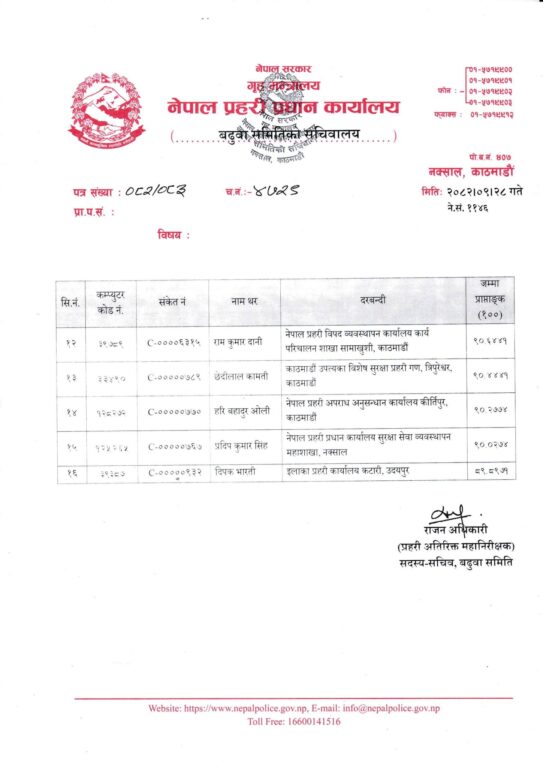 बढुवा सिफारिस हुने सूचीको पहिलो नम्बरमा डीएसपी पुष्पराज मल्ल छन् । डीएसपीहरू धर्मराज भण्डारी, रबिन श्रेष्ठ, दिलिप कुमार गिरी, कुमार विक्रम थापा, बुद्ध श्रेष्ठ, मान बहादुर राई, मोहन बहादुर खाण, श्यामु अर्याल, भरत लामा, सागर बोहरा, रामकुमार दानी र छेदीलाल कामतीलाई समेत बढुवा सिफारिस गरिएको छ ।