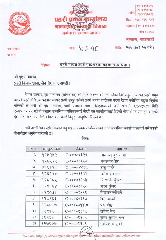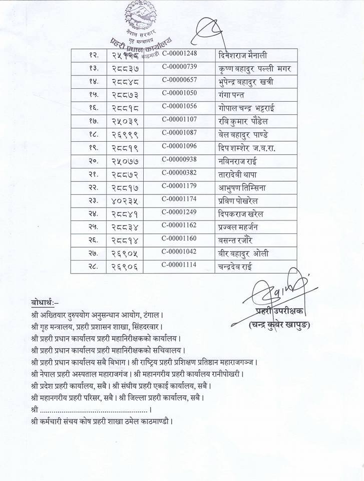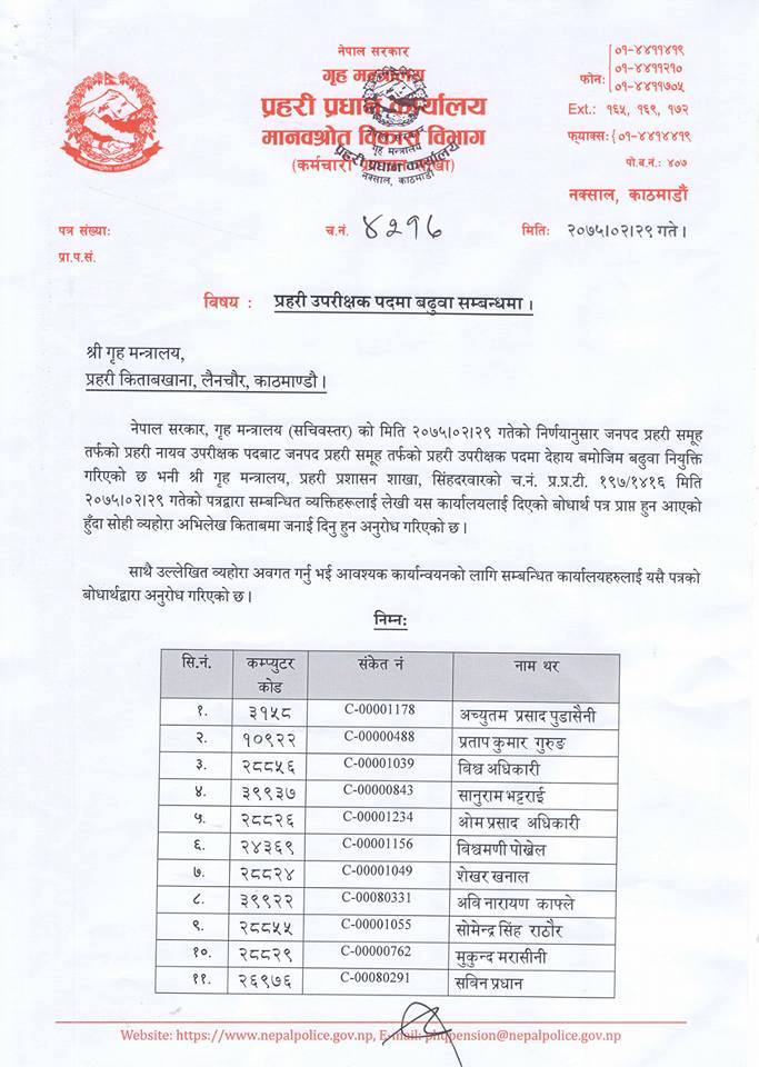 गृह मन्त्रालय सचिवस्तरीय निर्णय अनुसार २८ डिएसपी एसपीमा र ५५ प्रहरी निरीक्षक डिएसपीमा नियुक्त भएका हुन्।