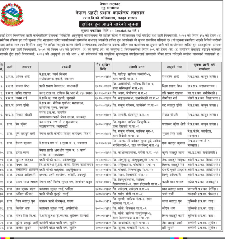 “बाटोको म्यादबाहेक सात दिनभित्र आफू गैरहाजिर रहनुको कारण खोली सन्तोषजनक स्पष्टीकरसहित सूचना जारी गर्ने कार्यालयमा हाजिर हुन आउनुहोला,” सूचनामा उल्लेख छ, “अन्यथा तपाईंहरू उपर प्रहरी नियमावली, २०७१ को नियम ११३ को उपनियम (१) को खण्ड (च) को कसुरमा नियमावलीको नियम १०२ को देहाय (ख) (१) बमोजिम सेवाबाट इटाउने कारबाही हुनेछ ।”