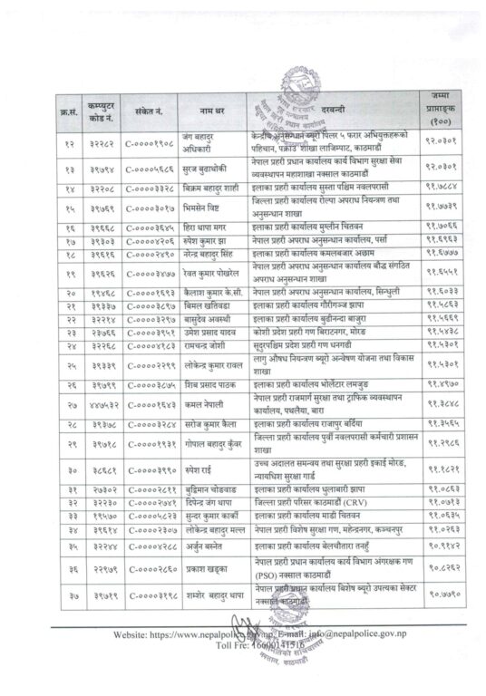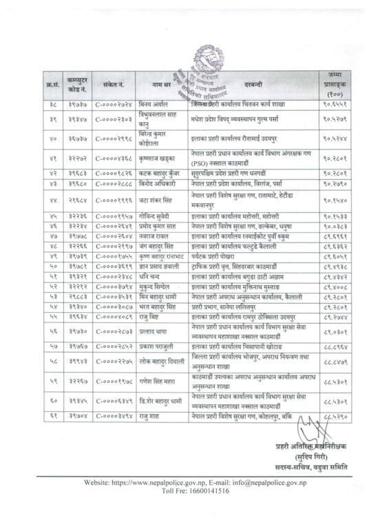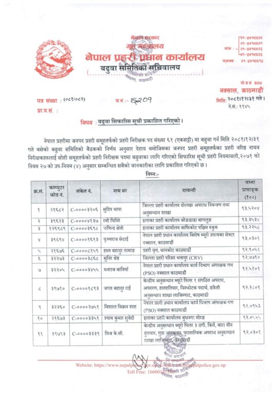 प्रहरी वरिष्ठ नायब निरीक्षकहरूलाई सोही समूहतर्फको प्रहरी निरीक्षक पदमा बढुवाका लाग गरिएको सिफारिस सूची प्रहरी नियमावली २०७१ को नियम २७ को उपनियम (४) अनुसार गरिएको जानकारी दिइएको छ ।