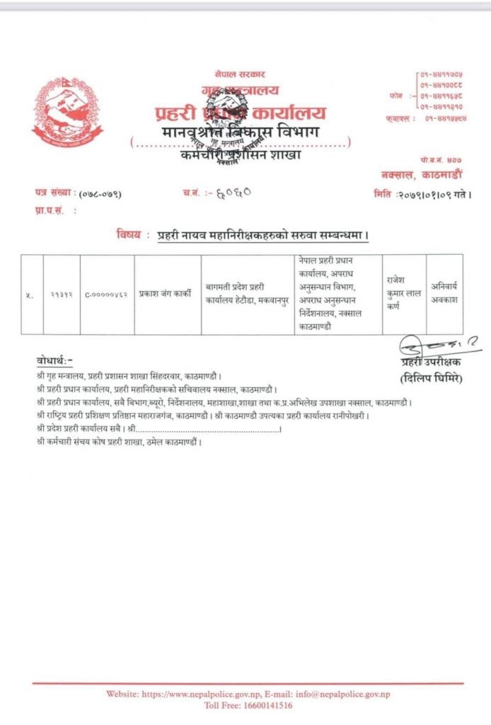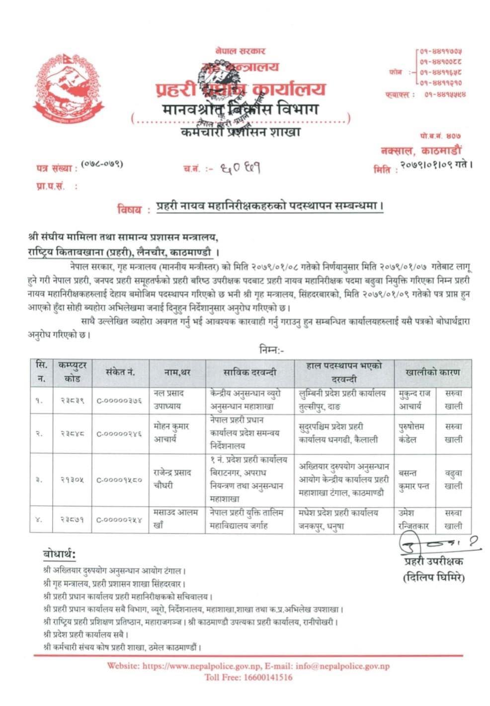 नेपाल सरकार गृह मन्त्रालय (मन्त्रीस्तर)को २०७९ वैशाख ९ गतेको निर्णयअनुसार ५ जना डीआईजीहरुको सरुवा गरिएको हो । यस्तै गृह मन्त्रालयले हालै प्रहरी वरिष्ठ उपरीक्षक (एसएसपी) बाट डिआईजीमा बढुवा भएका ४ जनाको पदस्थापन गरेको छ ।