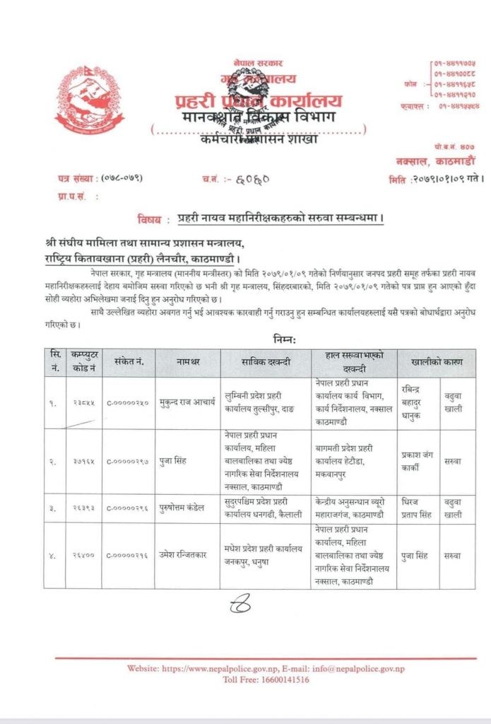 पदस्थापन हुनेहरुमा नल प्रसाद उपाध्याय, मोहन कुमार आचार्य, राजेन्द्र प्रसाद चौधरी र मसाउद आलम खाँ रहेका छन् ।उनीहरुलाई आजै प्रहरी महानिरीक्षक थापाले दर्ज्यानी प्रदान गरेका छन् ।
