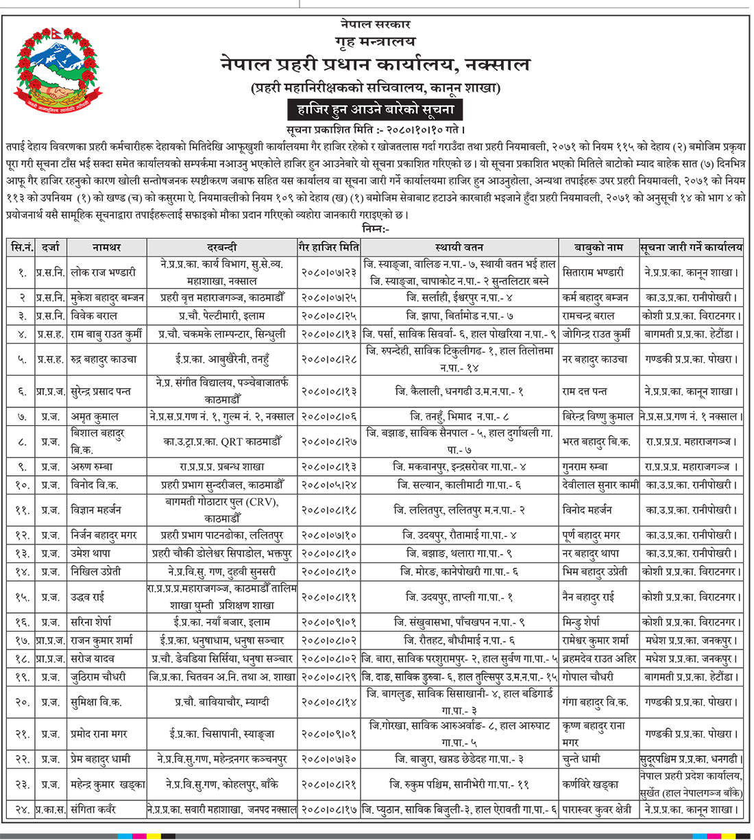 प्रहरी प्रधान कार्यालयले आफूखुसी कार्यालयमा हाजिर नभएको र खोजतलास गर्दा सम्पर्कमा नआएको भन्दै तत्काल सन्तोषजनक स्पष्टीकरणसहित हाजिर हुन भनेको छ । सात दिनभित्र हाजिर नभए सेवाबाट हटाउनेसम्मको कारबाही हुने सूचनामा उल्लेख छ ।