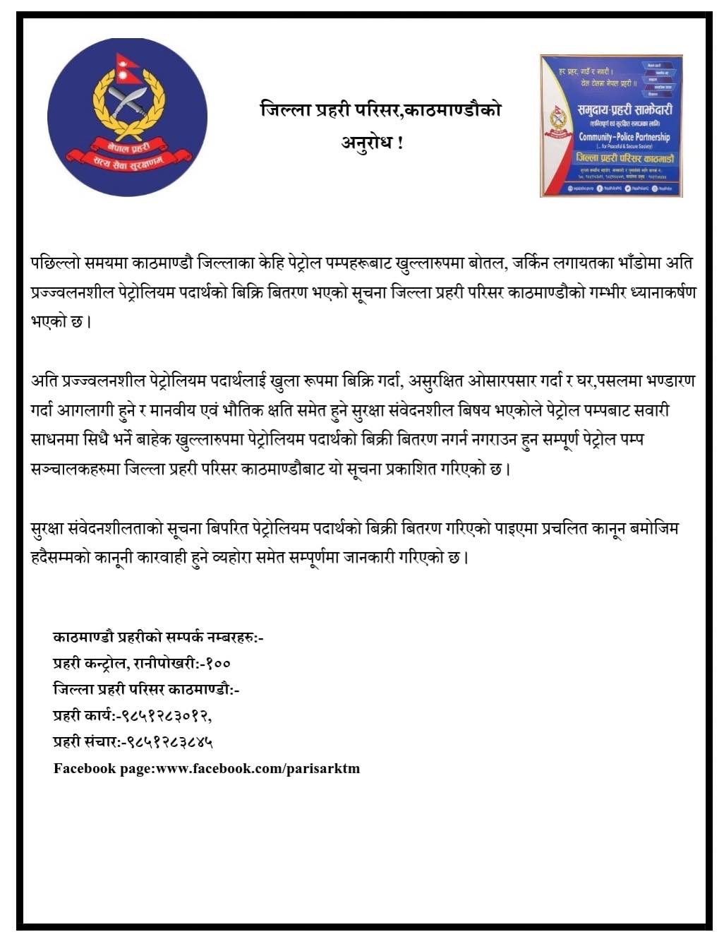 पम्पहरुबाट खुला रुपमा बोतल, जर्किनलगायतका भाँडोमा अतिप्रज्वलनशील पेट्रोलिय पदार्थ बिक्री गरेको पाइएकाले काठमाडौं प्रहरी परिसरको गम्भिर ध्यानकर्षण भएको भन्दै परिसरले तत्काल त्यसी बिक्री वितरण गर्ने कार्य बन्द गर्न निर्देशन दिएको हो।