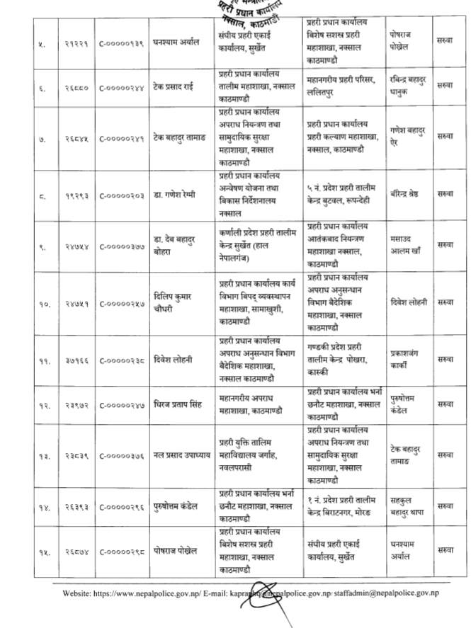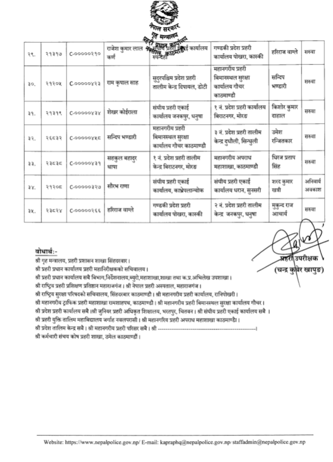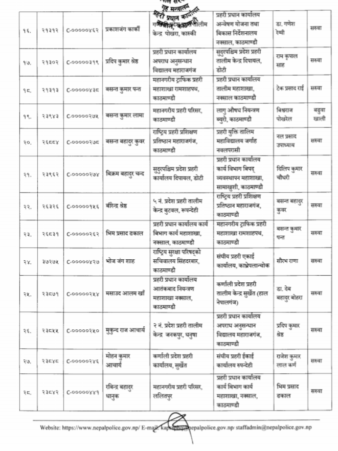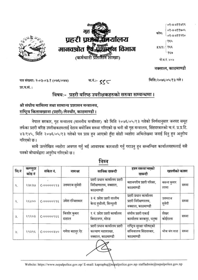 तालिम केन्द्रअन्तर्गत बुटवल तालिम केन्द्रको समादेशकमा डा. गणेश रेग्मी, पोखरामा दिवेश लोहनी, दुधौलीमा सन्दीप भण्डारी, नेपालगन्जमा मसाउद आलम खां, दिपायलमा प्रदीपकुमार श्रेष्ठ र जनकपुर तालिम केन्द्रमा हरिराज वाग्लेको सरुवा भएको छ । त्यसैगरी प्रहरी युक्ति तालिम महाबिद्यालय जर्गाहा नवलपरासीको प्रमुखमा एसएसपी वसन्त कुवंरको सरुवा भएको छ ।